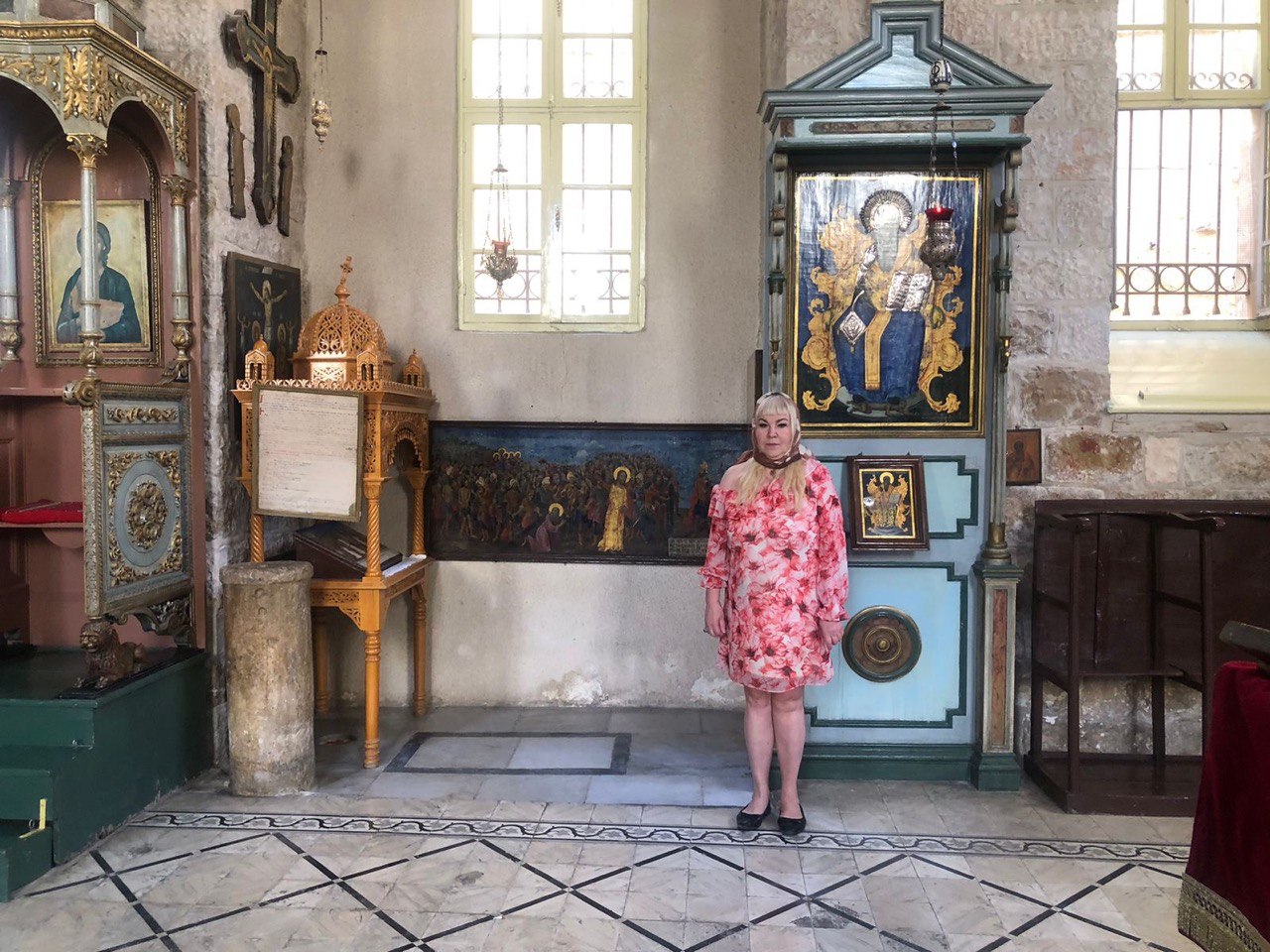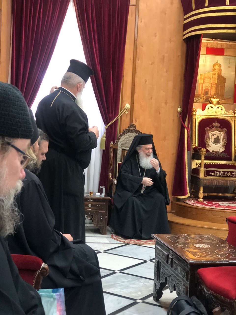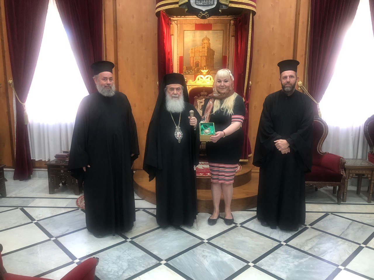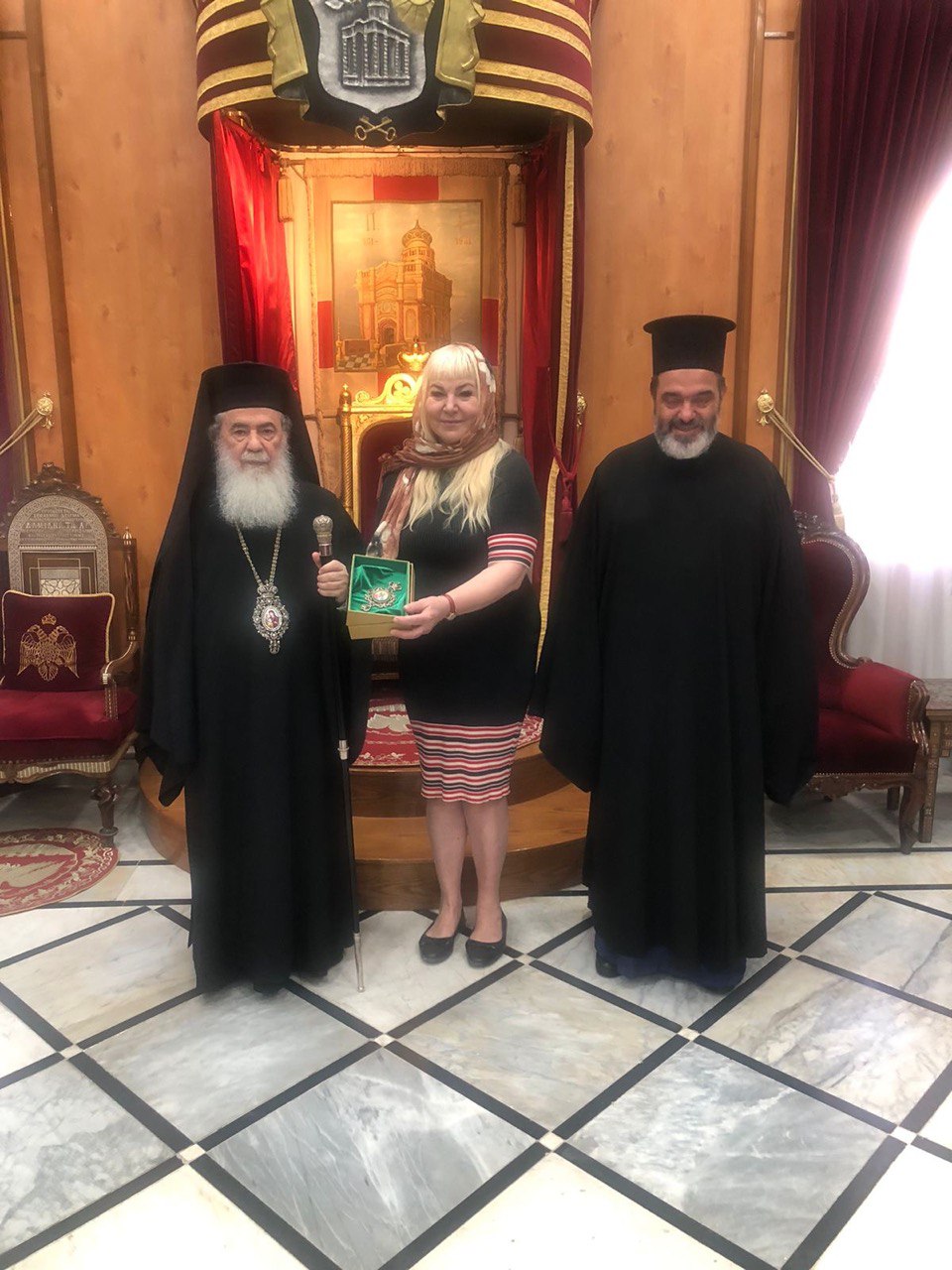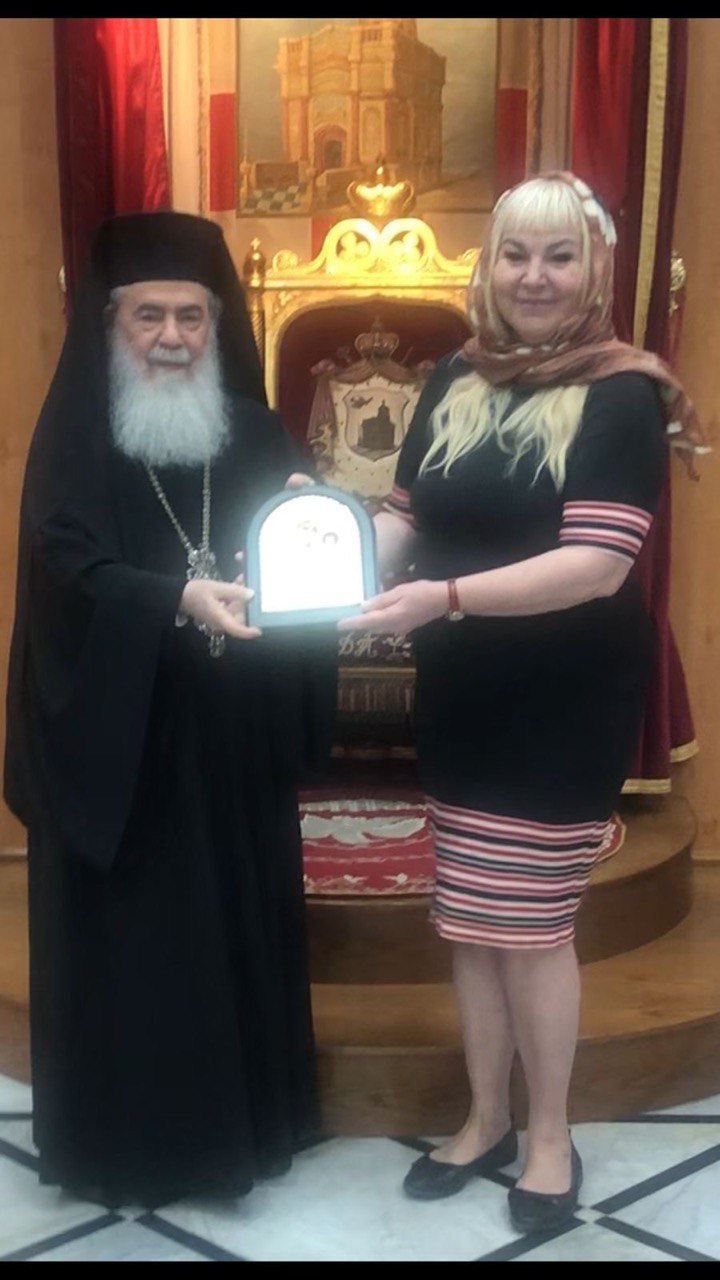 Иерусалим. Визит В Иерусалимскую Патриархию. Состоялась встреча с Патриархом Иерусалимским Феофилом. Святейший Патриарх благословил Президента фонда св. мученика Вонифатия на помощь монастырю св. Харалампия и паломническую службу. Он благословил Иконой Иерусалимской Божией матери на труды и президент фонда Мезенцева Н.С. передала Патриарху Феофилу Панагию русских мастеров.