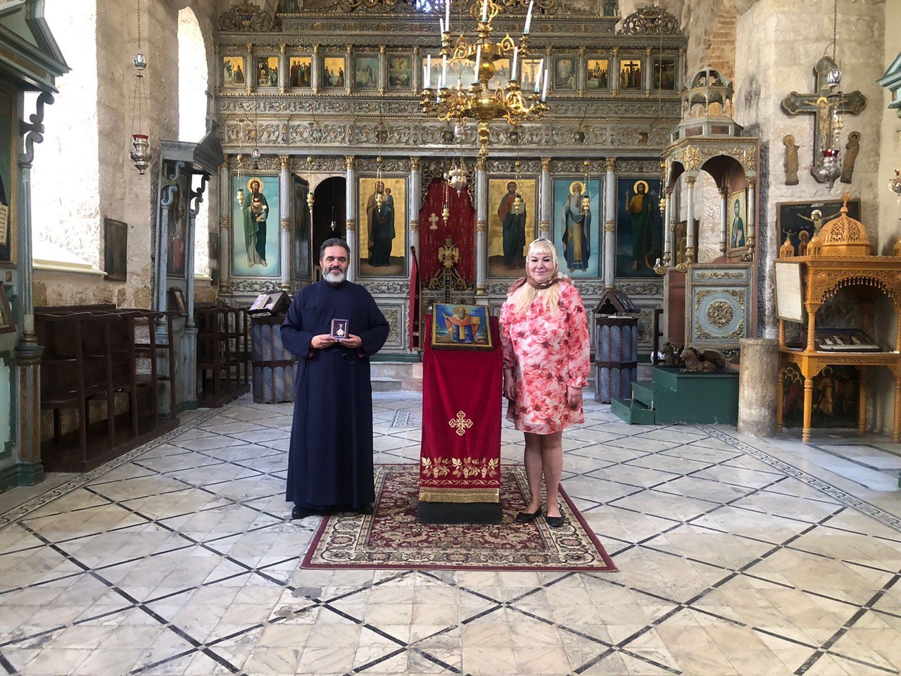Президент Фонда Святого великомученика Вонифатия, член Президентского клуба "Доверия" Наталья Сергеевна Мезенцева вручила орден Петра Багратиона настоятелю Иерусалимского монастыря архимандриту Амфилохию.