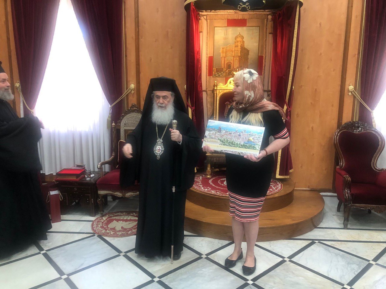 Иерусалим. Визит В Иерусалимскую Патриархию. Состоялась встреча с Патриархом Иерусалимским Феофилом. Святейший Патриарх благословил Президента фонда св. мученика Вонифатия на помощь монастырю св. Харалампия и паломническую службу. Он благословил Иконой Иерусалимской Божией матери на труды и президент фонда Мезенцева Н.С. передала Патриарху Феофилу Панагию русских мастеров.